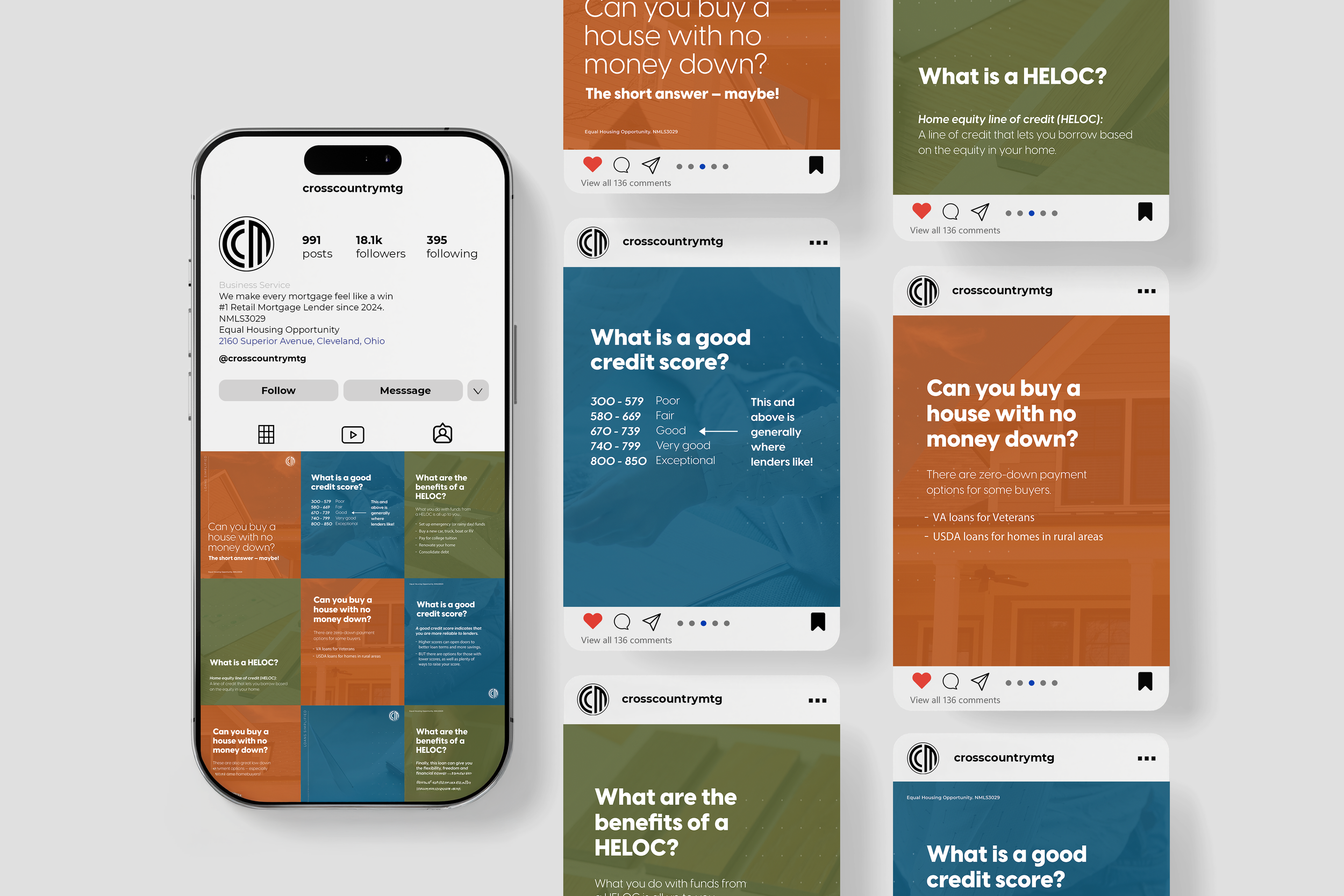 Following Crosscountry Mortgage brand guidelines, the color palette focuses on sky blue, black, and white, and accent colors—forest green, ocean, and tangerine—are incorporated selectively to add depth, visual interest, and emphasis while preserving brand integrity. Also following the brand guidelines, Visby and Montserrat ensure readability, hierarchy, and consistency across all marketing materials.